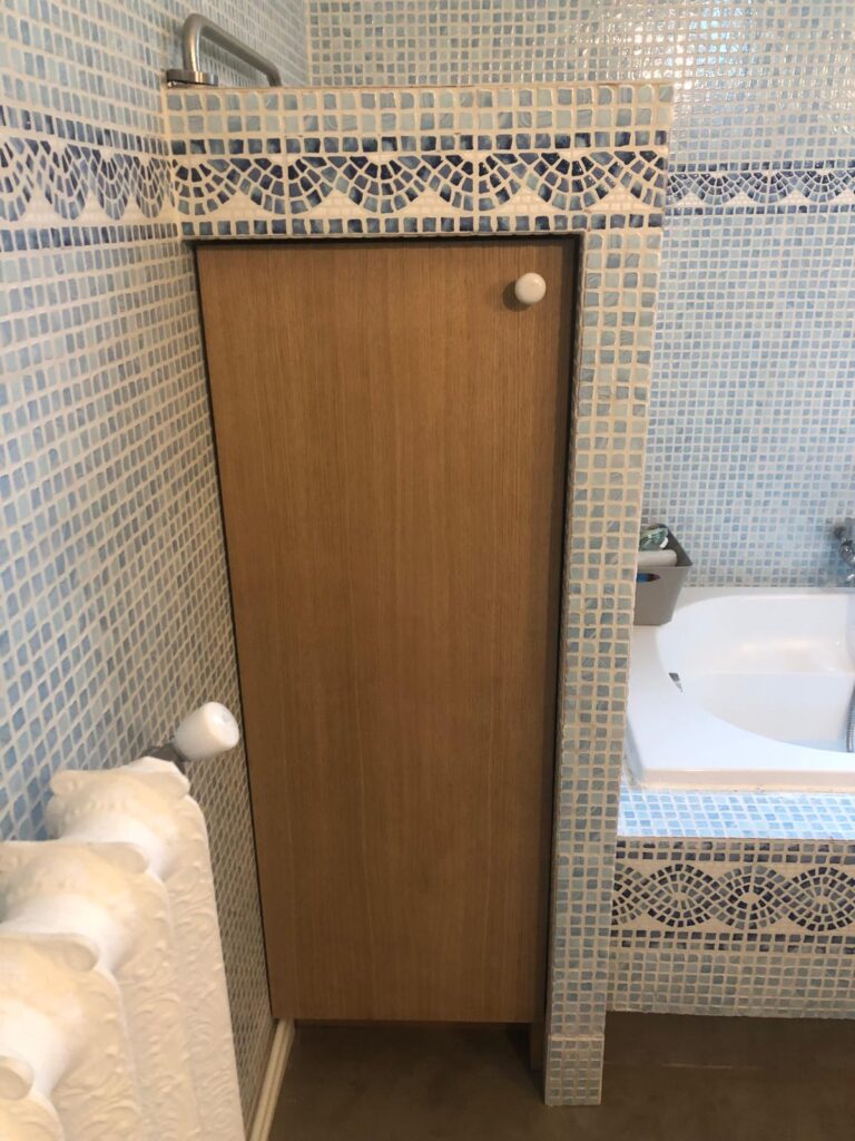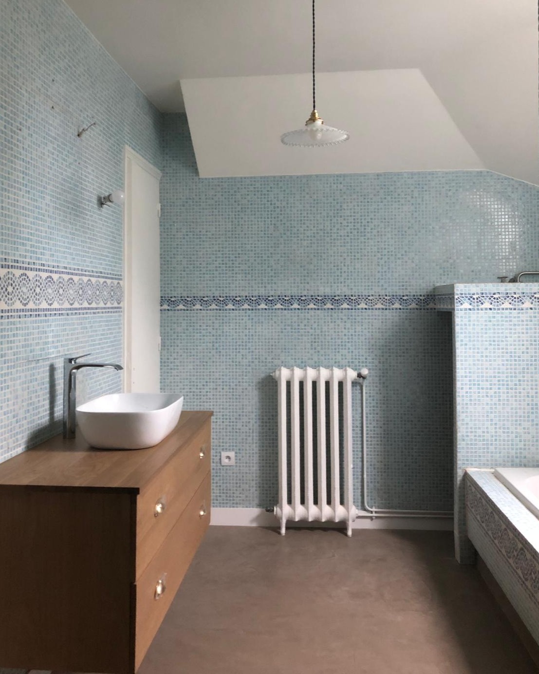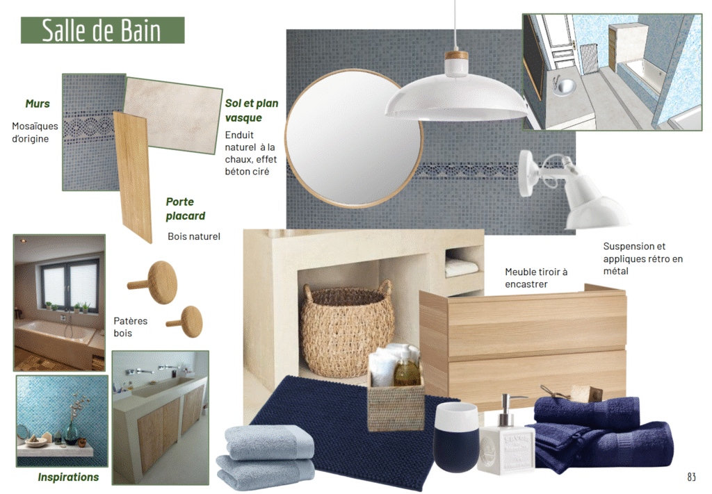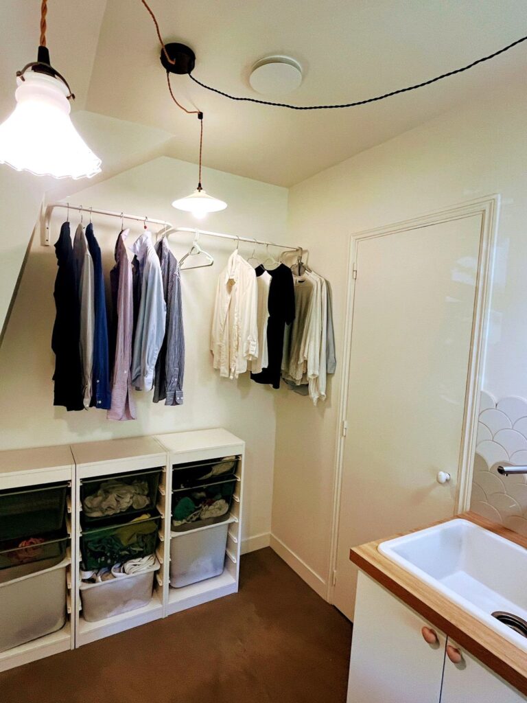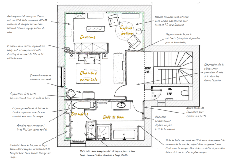 Les clients souhaitaient repenser l’espace non exploité du 2ème étage de leur maison. Leur demande: créer une suite parentale et un espace buanderie, tout en conservant la disposition de la salle de bain existante. Soucieux de respecter dans la mesure du possible une démarche écoresponsable, le choix de matériaux écologiques et de mobilier de récupération a été primordial dans cette élégante rénovation.
